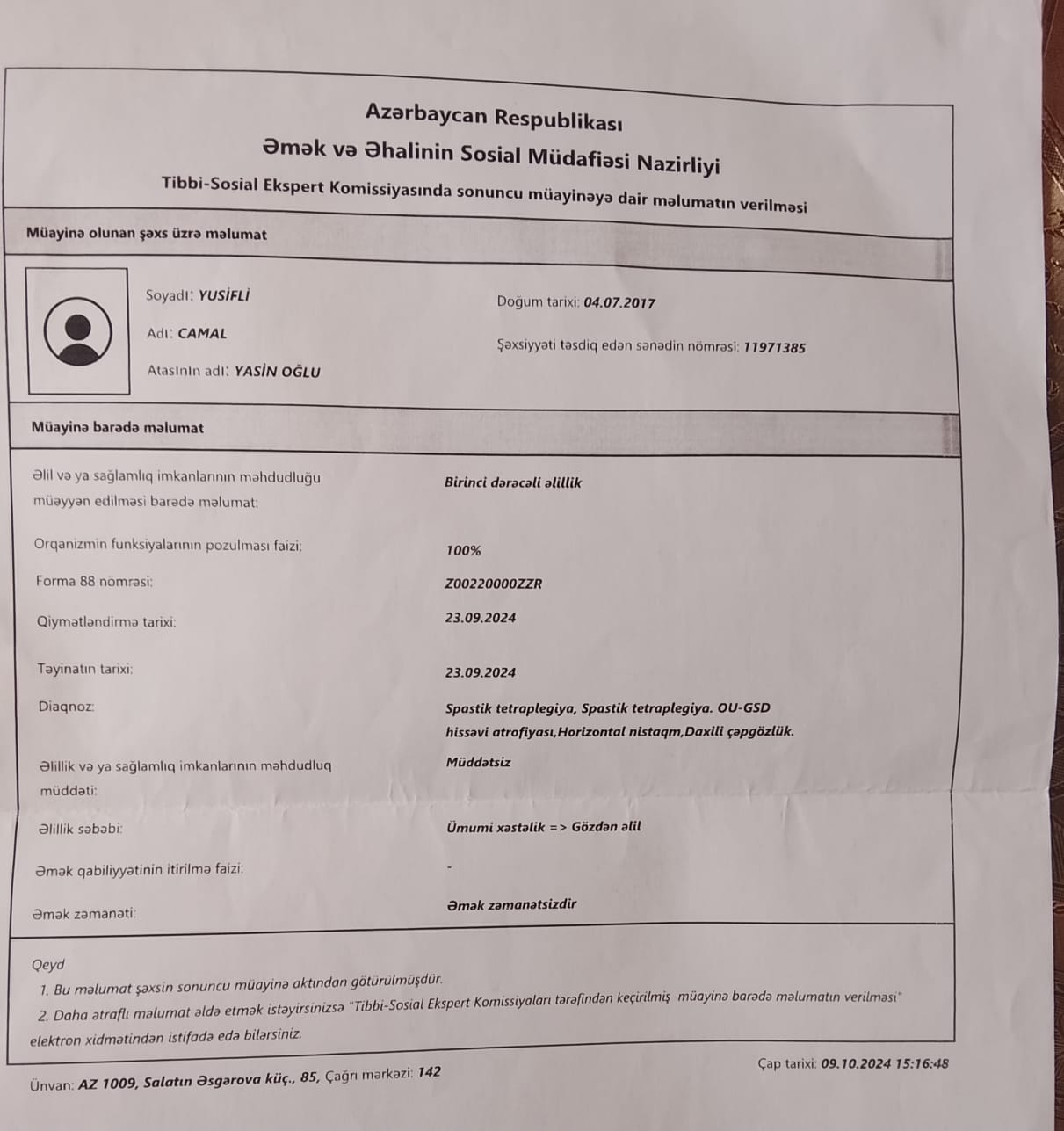 Oğlum, Yusifli Camal Yasin oğlu, ağır dərəcəli (I qrup) serebral iflic və epilepsiya xəstəliklərindən əziyyət çəkir. O, yeriyə bilmir, otura bilmir, danışa bilmir və həyatının hər anında xüsusi tibbi nəzarətə, müalicəyə və reabilitasiyaya ehtiyac duyur.