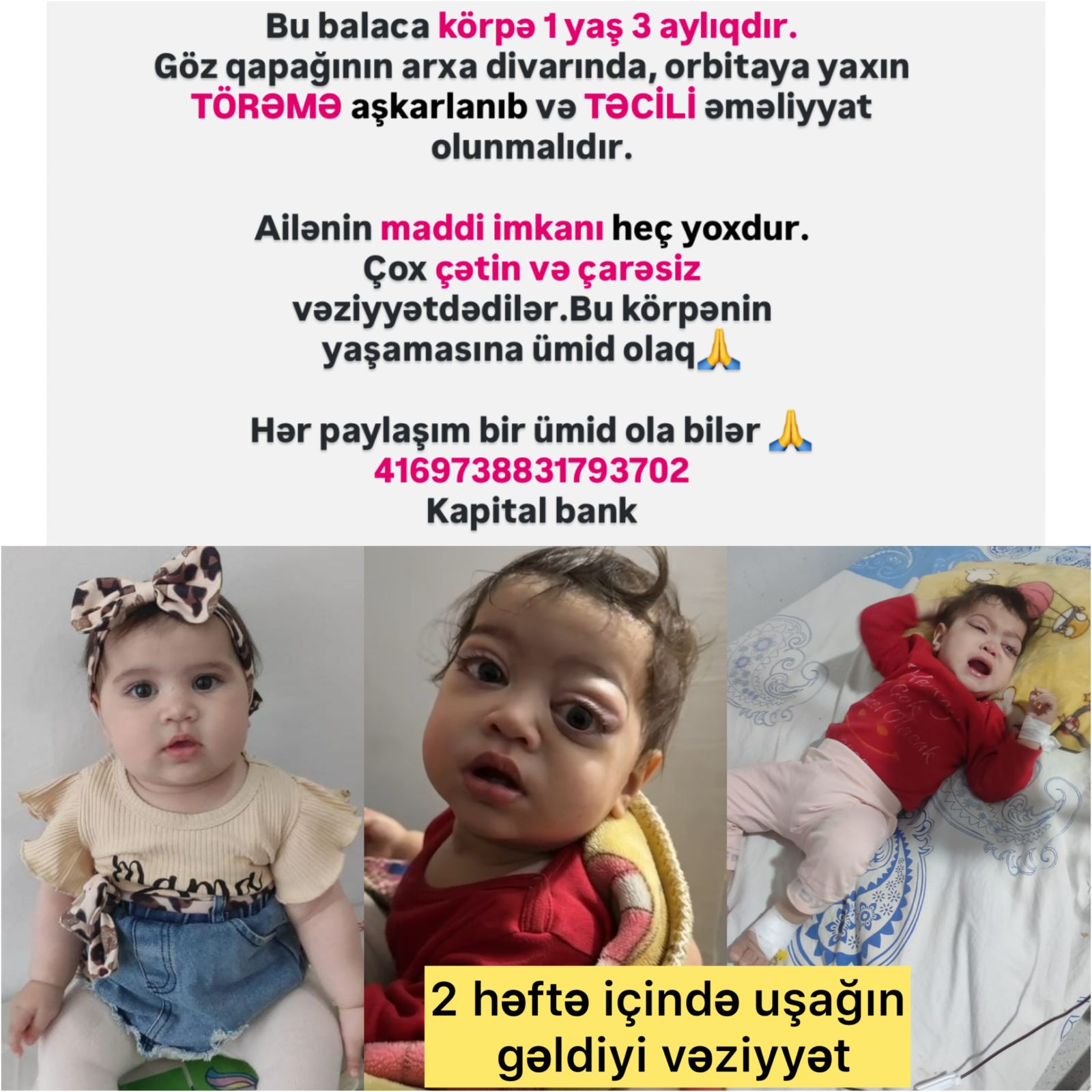 Həkimlərin verdiyi məlumata görə, körpənin göz qapağının arxa divarında, orbitaya yaxın nahiyədə törəmə aşkarlanıb. Uşağın həyatının xilas olunması üçün təcili cərrahi əməliyyatın aparılması zəruridir.